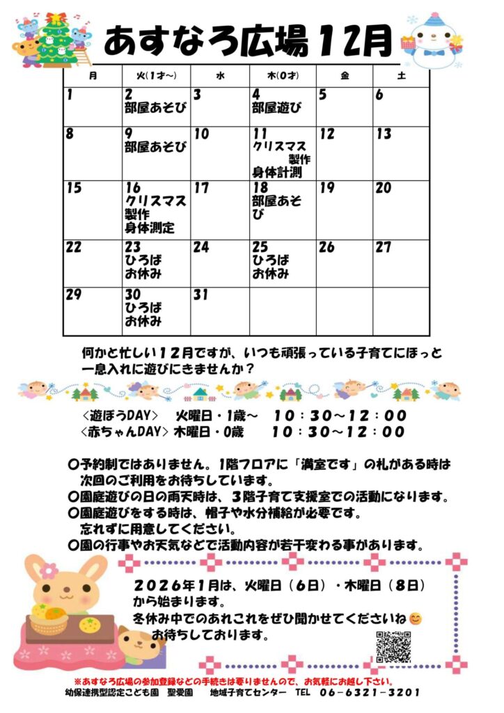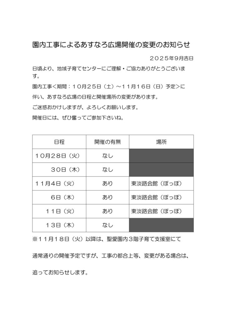子育てプラザで配布しているカレンダーでは、18日(木)は、「お部屋あそび」となっていましたが、お休みに変更となりましたのでご注意下さい。よろしくお願いいたします。