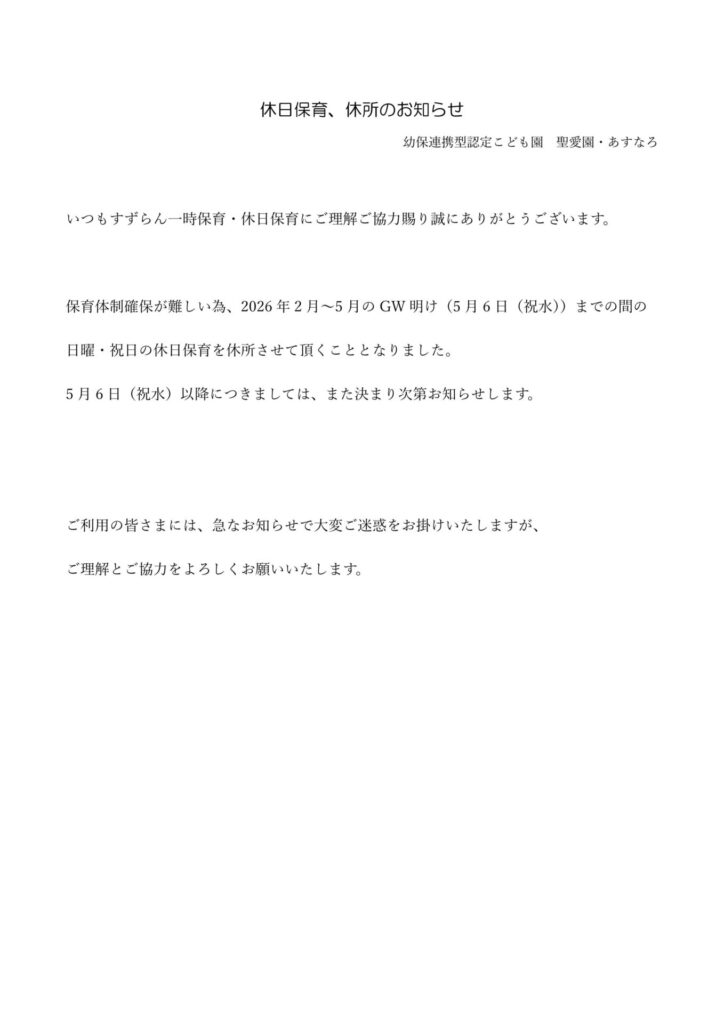 休日保育休所のお知らせ
