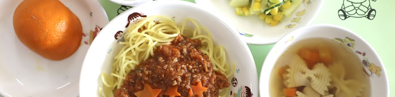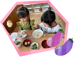 同じグループの友だちと、おいしく楽しく食事ができるように、挨拶や姿勢、食具の使い方を覚えていきます。食べ物が自分の身体の中でどんな力になってくれるのかを知り、食の素材に触れる事で食に対しての興味をもてるようにしていきます。