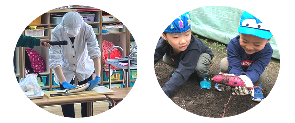 料理に使用する食材に興味をもつよう、食材の色・形・香りなどを体感します。また、食材に触れる機会を増やし、調理の段階にも参加していきます。旬を迎えた野菜を献立に取り入れ、様々な調理方法で提供します。 (野菜の様々な切り方を知る、きのこちぎり、さつまいもほり、サバの解体ショーなど)
