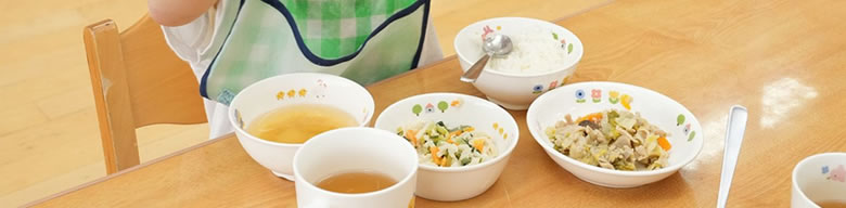 いろいろな食べ物を見る、触る、味わう体験をたくさんもつようにし、家族や友だちと一緒に食べることを楽しむ体験を日々積み重ねながら、自分で食べようとする力を育んでいきます。